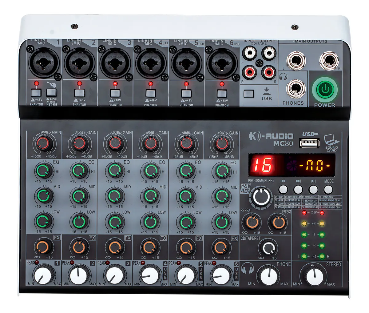A K-Audio MC80 possui processador digital de efeitos com resolução de 24 bits e 16 DSP, oferecendo reverberações e efeitos que ajudam a dar profundidade e ambiência ao áudio. Esse recurso é muito útil para vocais, instrumentos e transmissões ao vivo.